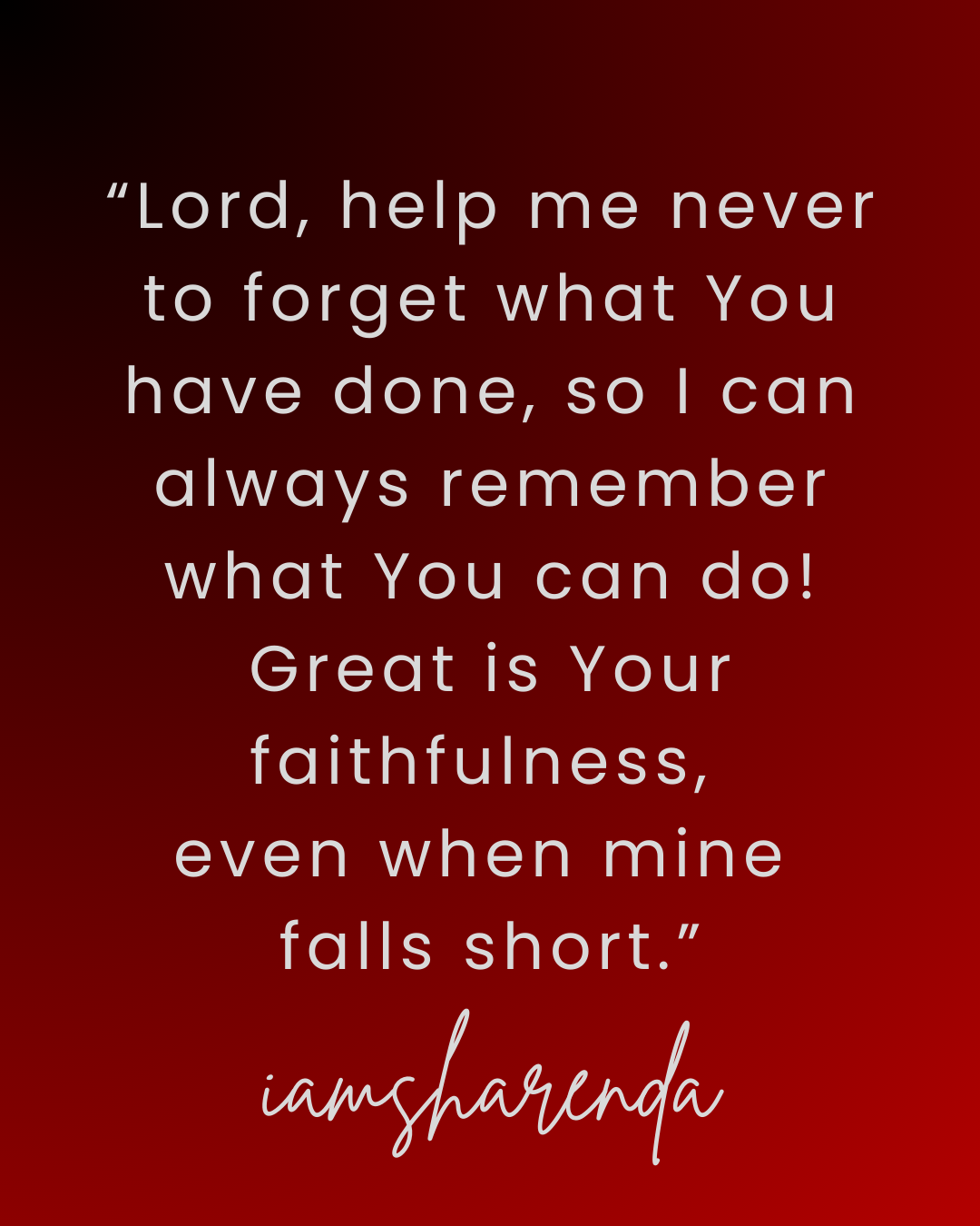 “Lord, help me never to forget what You have done, so I can always remember what You can do! Great is Your faithfulness, even when mine falls short.”